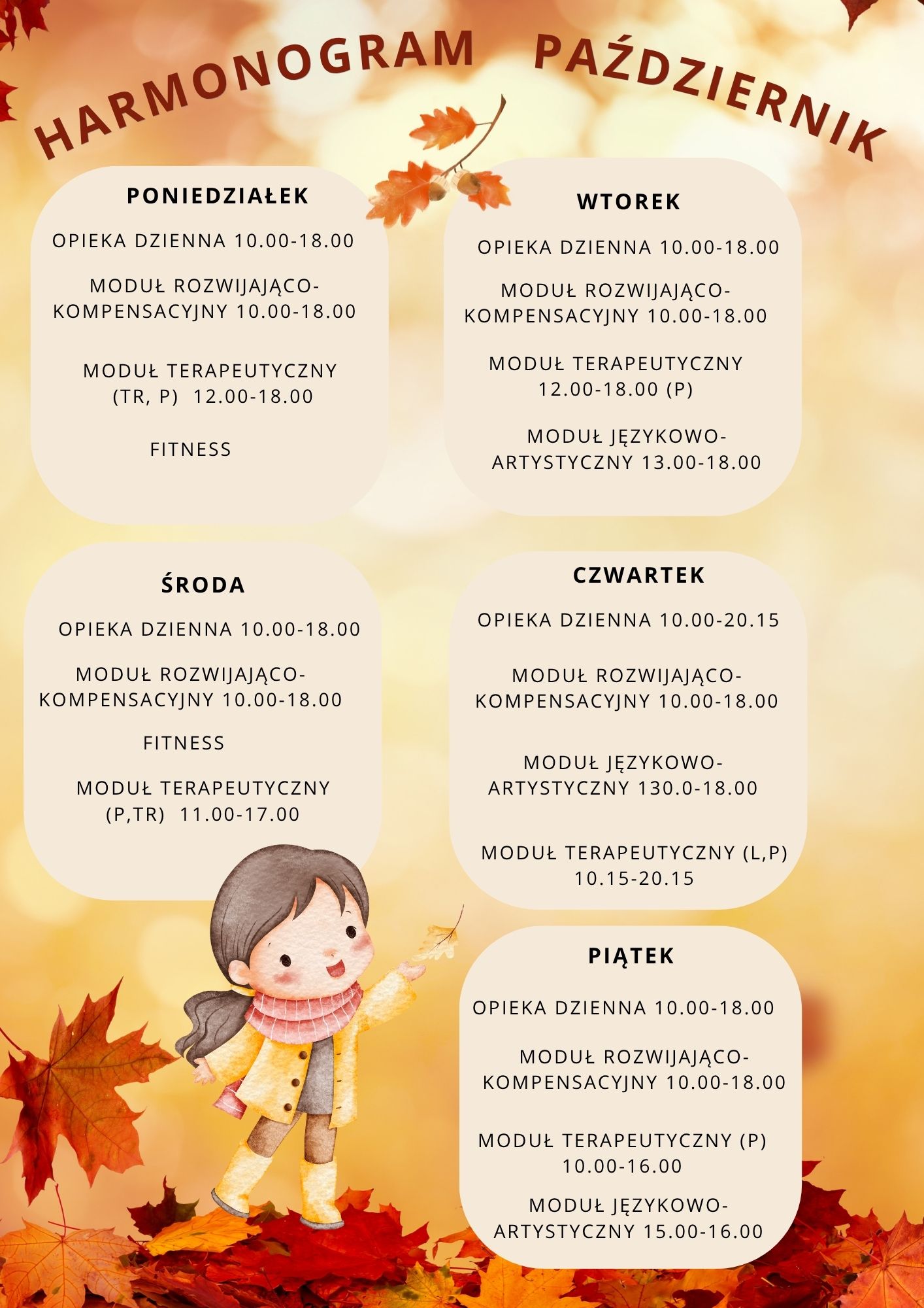 #FunduszeUE Jesienny harmonogram zajęćKochani, nadchodząca jesień zapowiada się u nas wyjątkowo ciekawie!Przygotowaliśmy dla Was pełen kolorów i inspiracji harmonogram zajęć na najbliższe tygodnie.Będzie kreatywnie, edukacyjnie i oczywiście z mnóstwem dobrej zabawy! Aktualności Kuźni PoprzedniNastępny